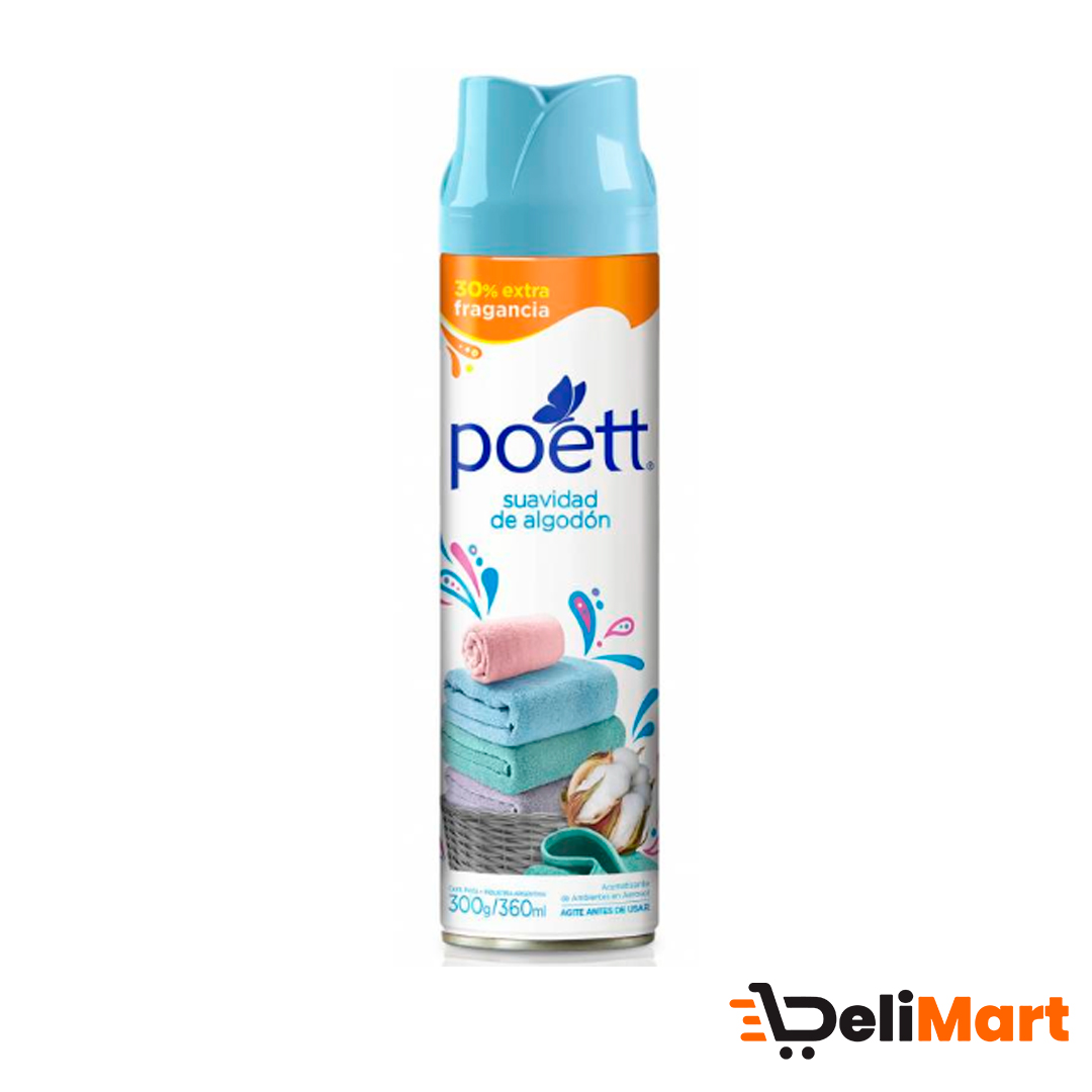 Descubre la suavidad del algodón en tu hogar con el Aromatizante de Ambiente Poett. Con su fórmula de 360 ml, podrás disfrutar de un ambiente fresco y agradable en cualquier momento. Encuéntralo en la sección de productos de limpieza de tu supermercado y